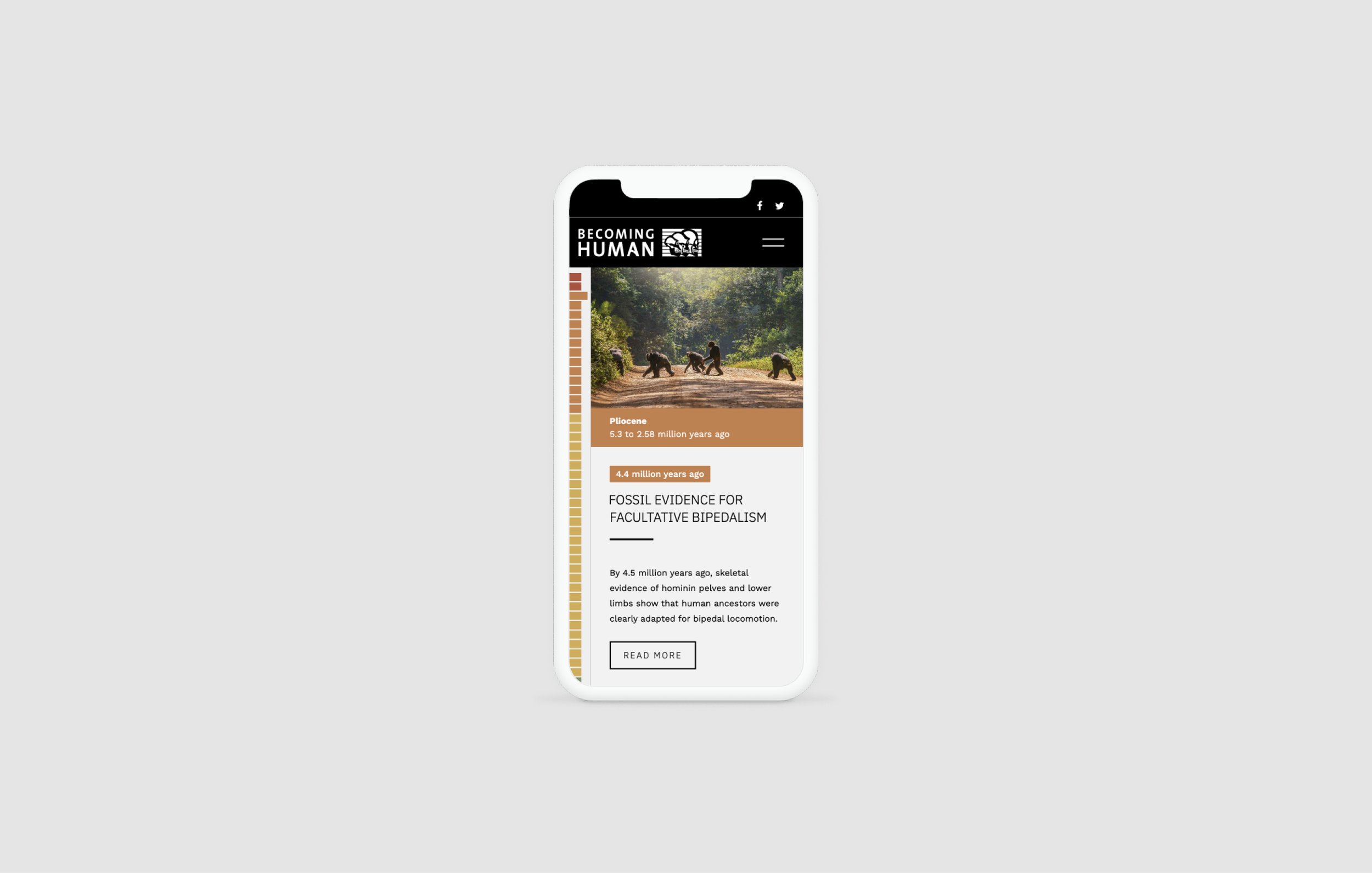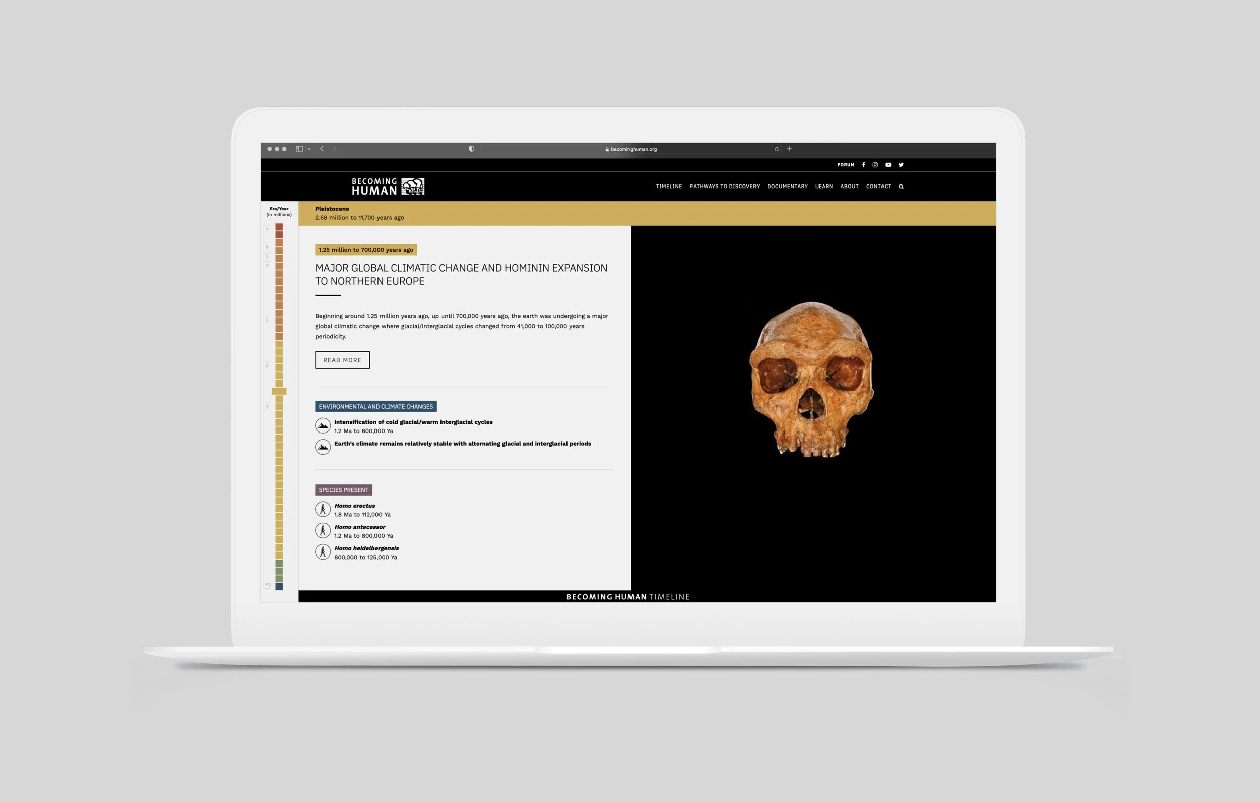 I led the design of a resource-driven website for ASU’s Institute of Human Origins, crafting a clean, accessible user experience for complex academic content. Alongside a developer and account manager, I proposed the logo treatment and designed an interactive timeline to help users intuitively explore key milestones in human history.