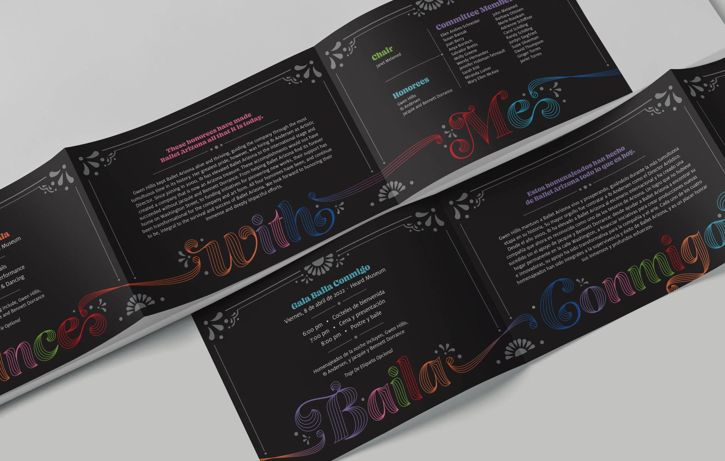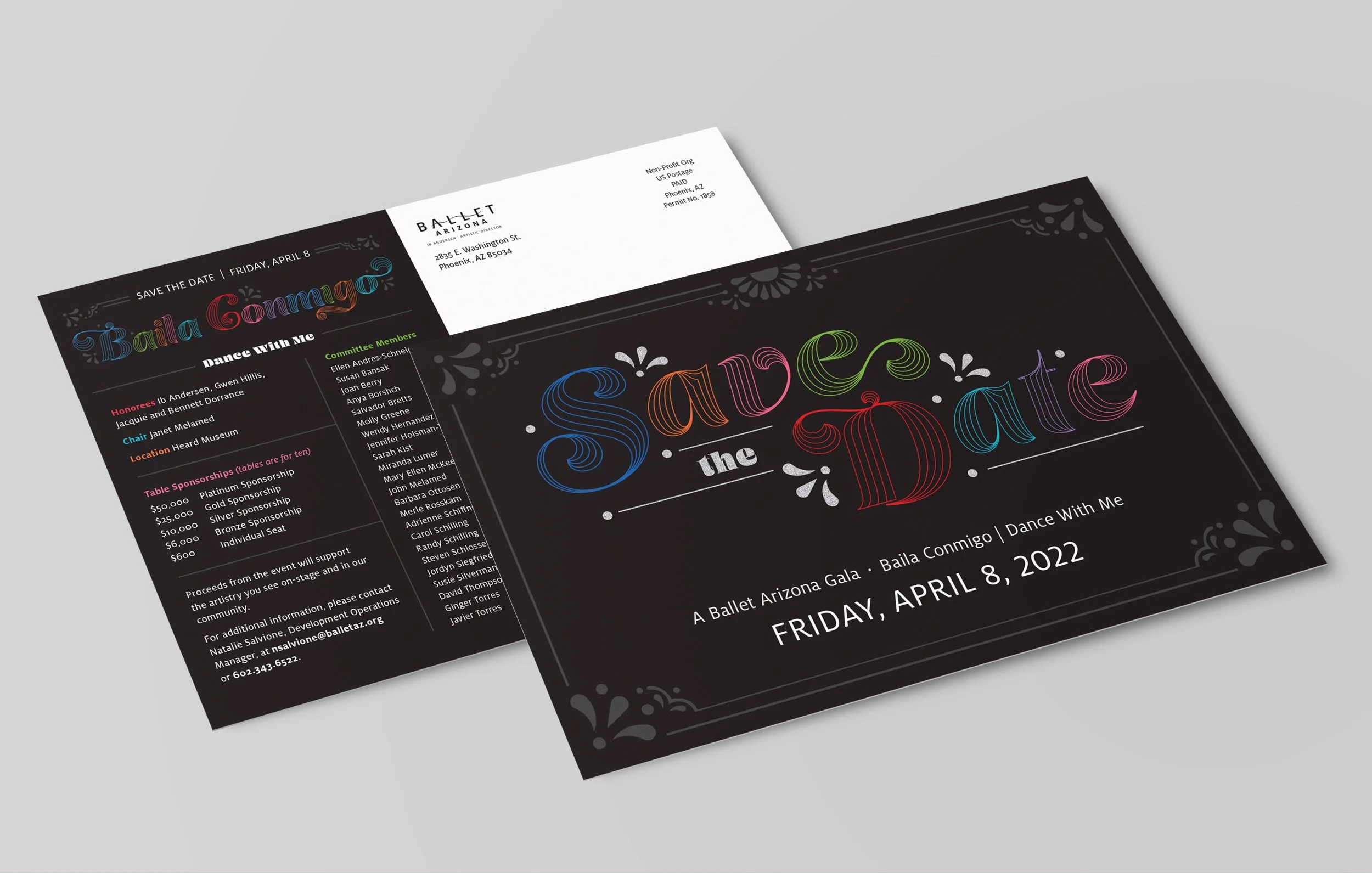 PROJECT I designed and oversaw production of the save the date and invitation package for Ballet Arizona’s annual Dance With Me gala event.
